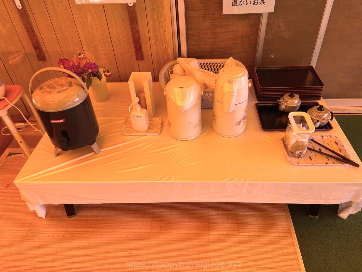 飲み物はセルフサービスで、温かいお茶と冷たい水が用意されています。