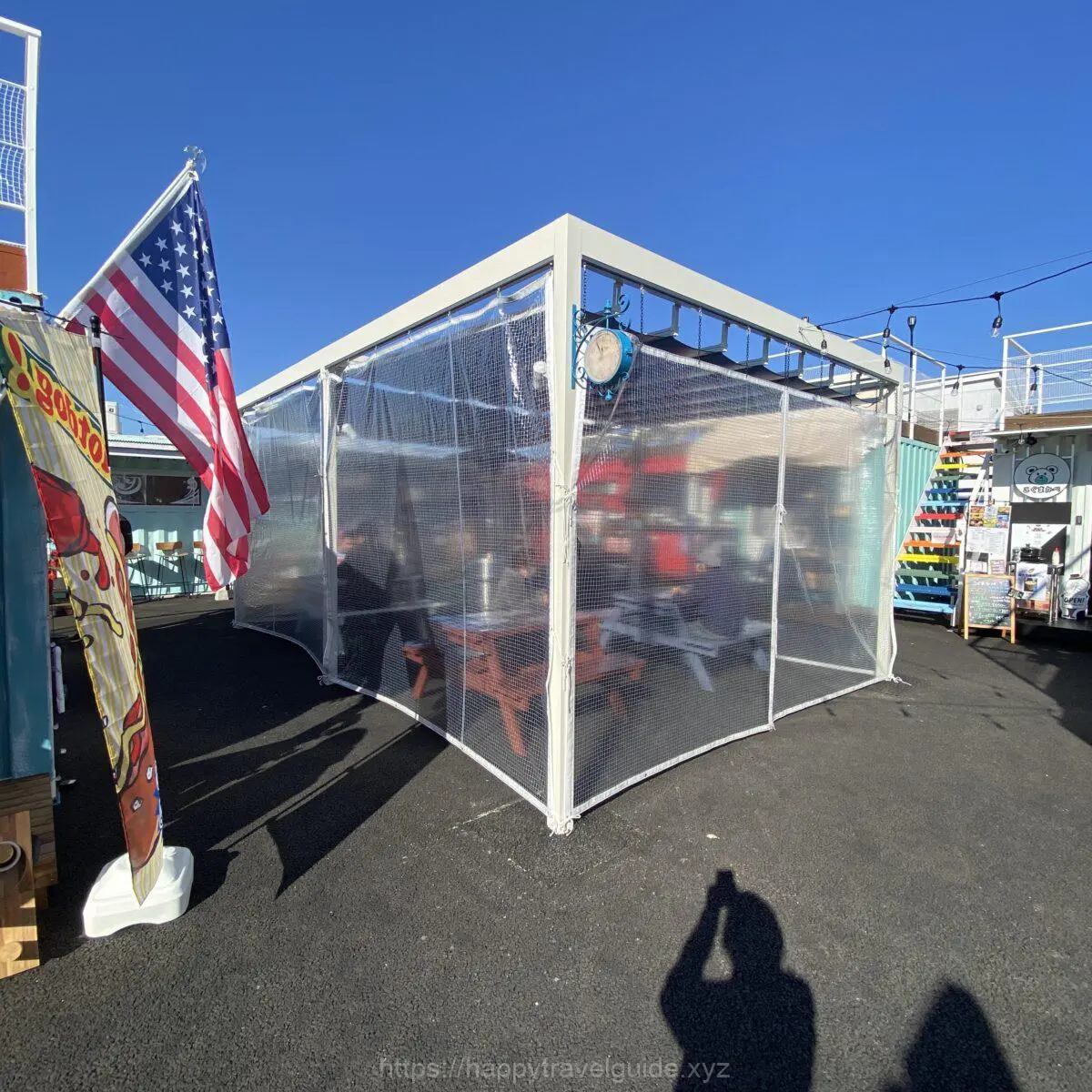 今の季節は屋外での食事は寒すぎますが、周囲をビニールの壁で覆われていて中にはストーブもあるので問題無し。