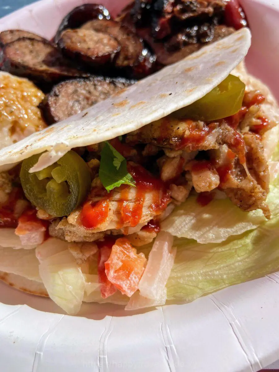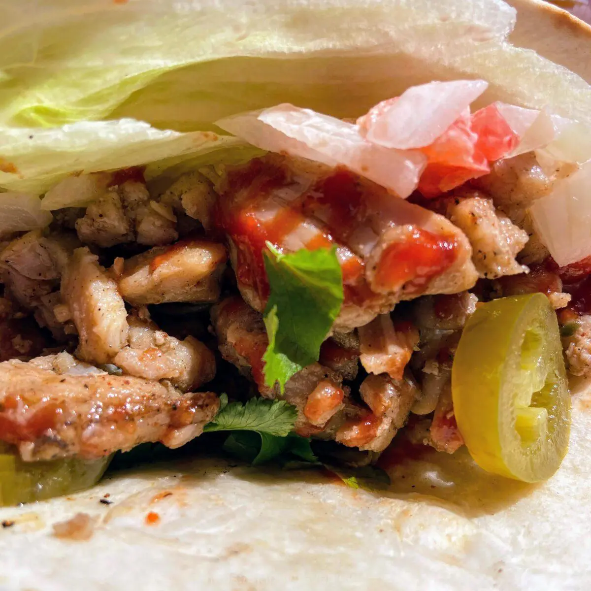 タコスはピリ辛で野菜と肉のマリアージュがたまりません。