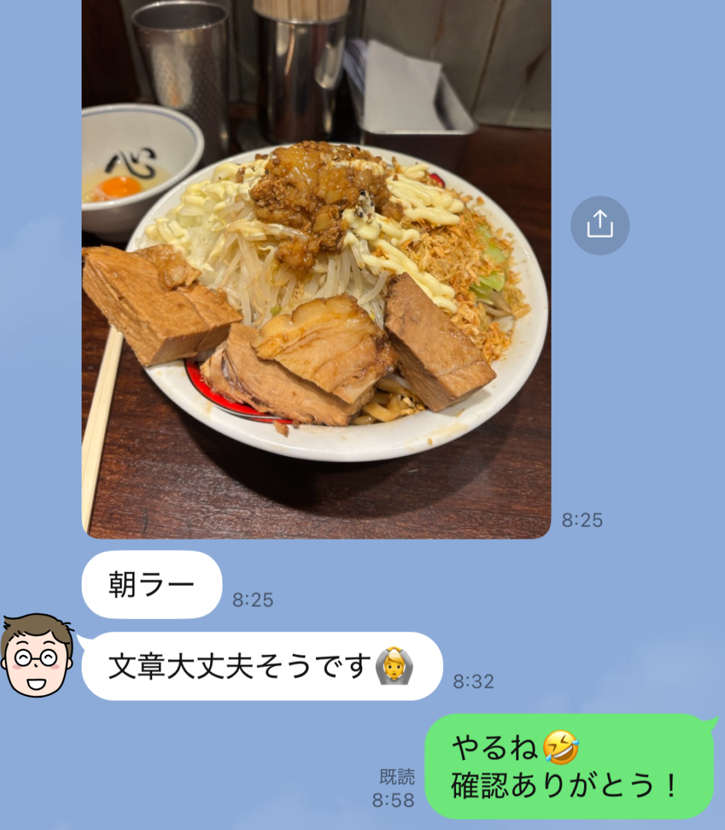 「美味しいラーメン食べたよ~。ブログチェックOK!」の連絡です。