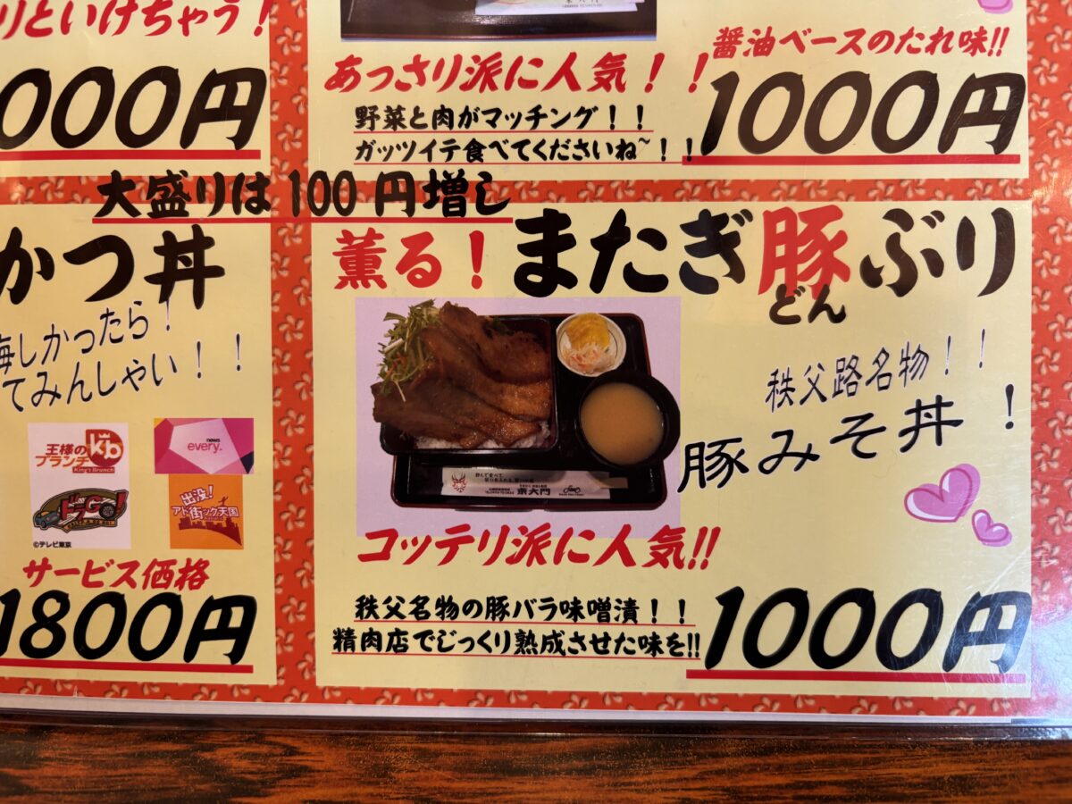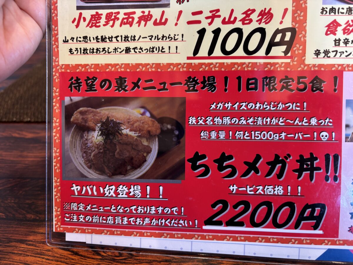 メガサイズのわらじカツ丼に秩父名物の豚の味噌漬けがどーんと乗った総重量1.5キロのビッグサイズ。