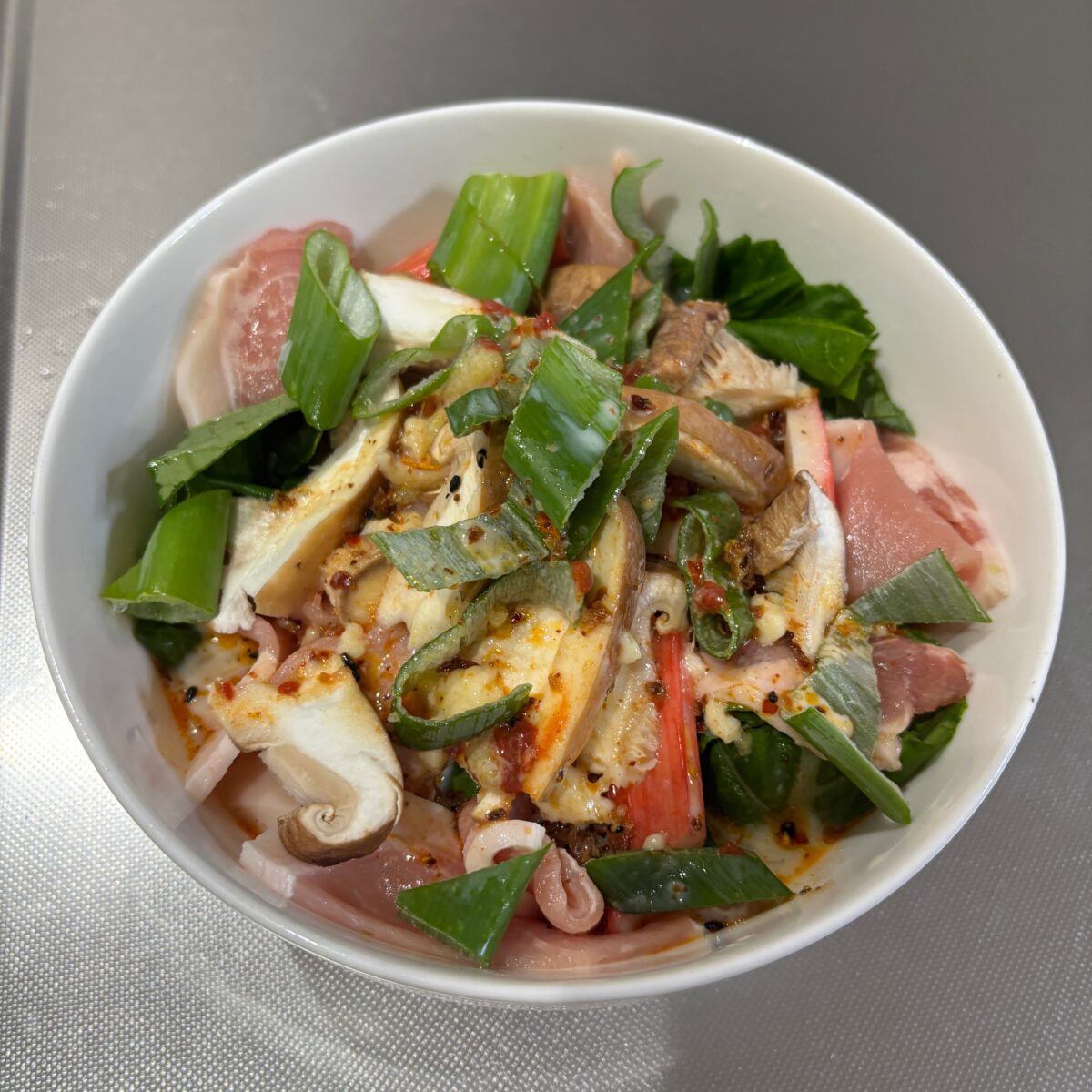 一人ご飯はまな板も使わず、調理バサミで切った野菜とチキンスープ、それに調味料を入れてレンジで5分。