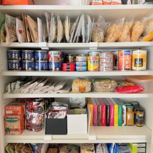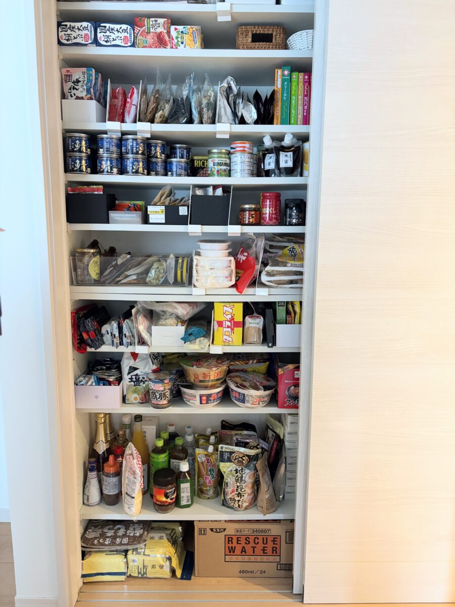 わが家の備蓄は、防災バッグや収納BOXにまとめるタイプではなく、暮らしの中に溶け込んだパントリー内でのローリングストック。